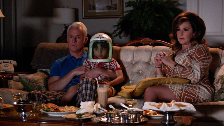 In “Waterloo” [7.7] Bert Cooper, the firm’s co-founder makes the accurate yet cutting remark that Roger is “not a leader of men.” During the moon landing, in contrast to Burt’s assessment, we see that Roger has resumed a leadership role within his family, acting as the patriarch who has a hand in raising the astronaut on his lap. Margaret who once forbade her childish father from seeing her son Ellery has basically turned her parenting duties over to him and to the mother who spent her maternal years “locked in the bathroom with a bottle of gin.” Roger’s moon landing awe, like his drug induced sleep, is also interrupted by a phone call – this one telling him that Bert Cooper has died.