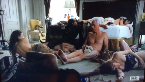 During the first half of Season Seven Roger’s character starts to shift and show significant development. For example, when he makes his first appearance in “Time Zones” [7.1] Roger is awakened by a phone call while in a hotel room surrounded by six or seven naked women. One of the woman notes “we really got somewhere last night” suggesting that Roger’s affair with acid is still going strong.