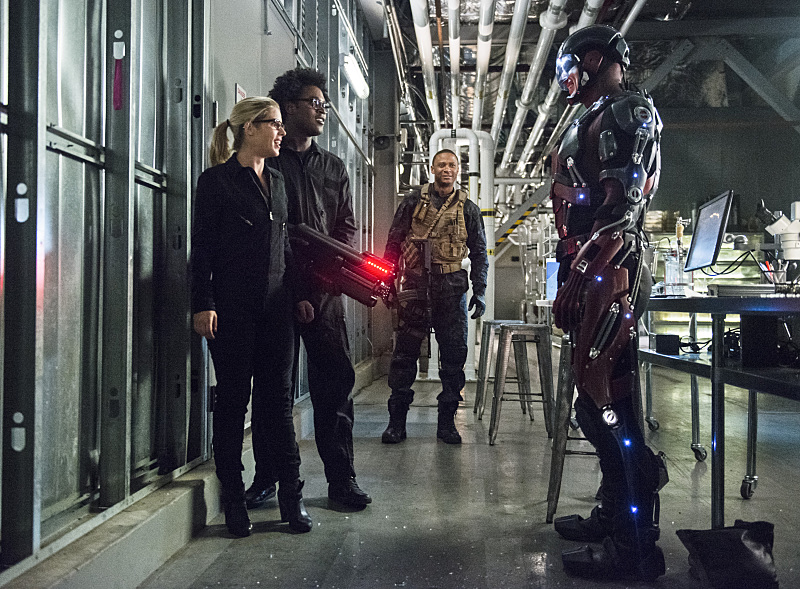 As for Oliver, he does not fully understand how central Felicity’s career is to her happiness until she delivers her powerful “I was never that girl” speech. He learns, with some help from Dig, that Felicity’s happiness depends upon more than his ability to climb the salmon ladder or cook a proper chicken cordon bleu. If he is going to keep her (and live off of her money), he had better take her career seriously. To his credit, he does exactly that. Felicity leads the team in an elaborate plan to free mini-Ray from Darhk’s clutches. The whole team backs her up without question, even Sara who’s not yet housebroken. They succeed in bringing the ATOM back to his original size with his smile and intellectual prowess intact.