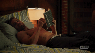 Compared to Ray Palmer, Oliver Queen has the brain power of a stegosaurus and Oliver knows it. After Felicity leaves to get Ray settled, you can almost see Oliver running around their loft saying, “She’ll be home any minute. That damn Palmer makes me look like a Neanderthal! I have to do something. F#ck! Why don’t I own any books? I could look smarter if I was reading a book!” Oliver settles for the blank green [arrow] journal someone presumably gave him for his birthday, rips his shirt off, and jumps into bed. Felicity finds him in repose and ready for sex. This man knows his assets.